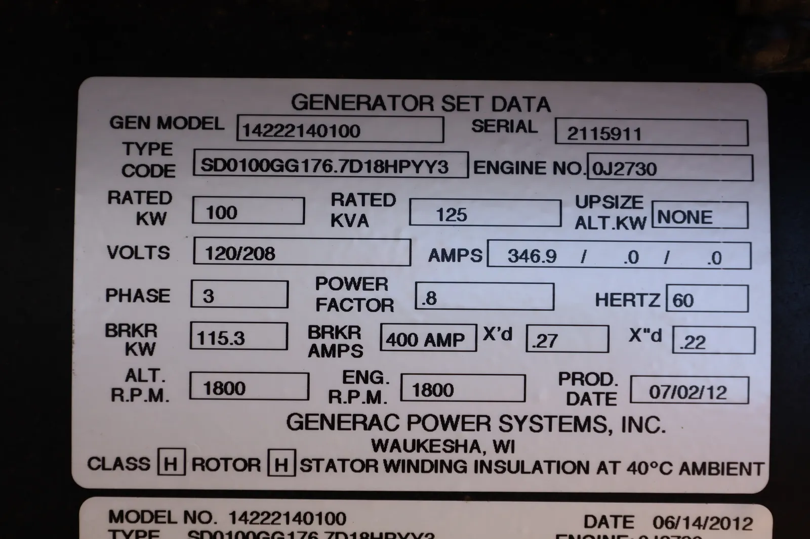 EnclosedUsed Generac 100kW Diesel generator. This power unit is enclosed and has approximately 741 hours of use. It provides power at 120/208v and is ready to ship from our Austin, Texas facility.