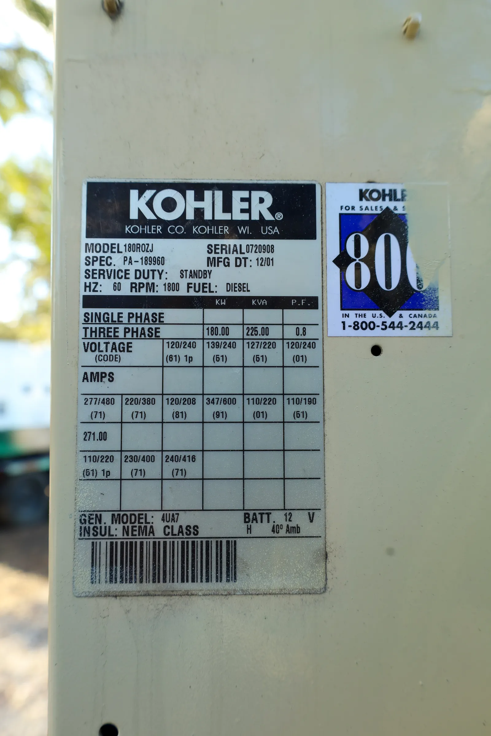 Used Kohler/Rehlko 180kW Diesel generator. This Standby power unit features a Weatherproof enclosure and has approximately 319 hours of use. It provides Three-Phase power at 277/480v and is ready to ship from our Jacksonville, Florida facility.
