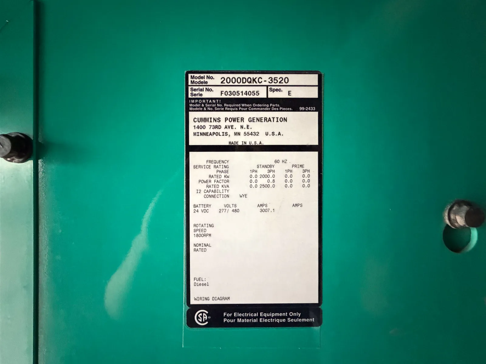 Used Cummins 2000kW Diesel generator. This power unit features a Trailer/SAE enclosure and has approximately 152 hours of use. It provides Three-Phase power at 277/480v and is ready to ship from our Brighton, Colorado facility.