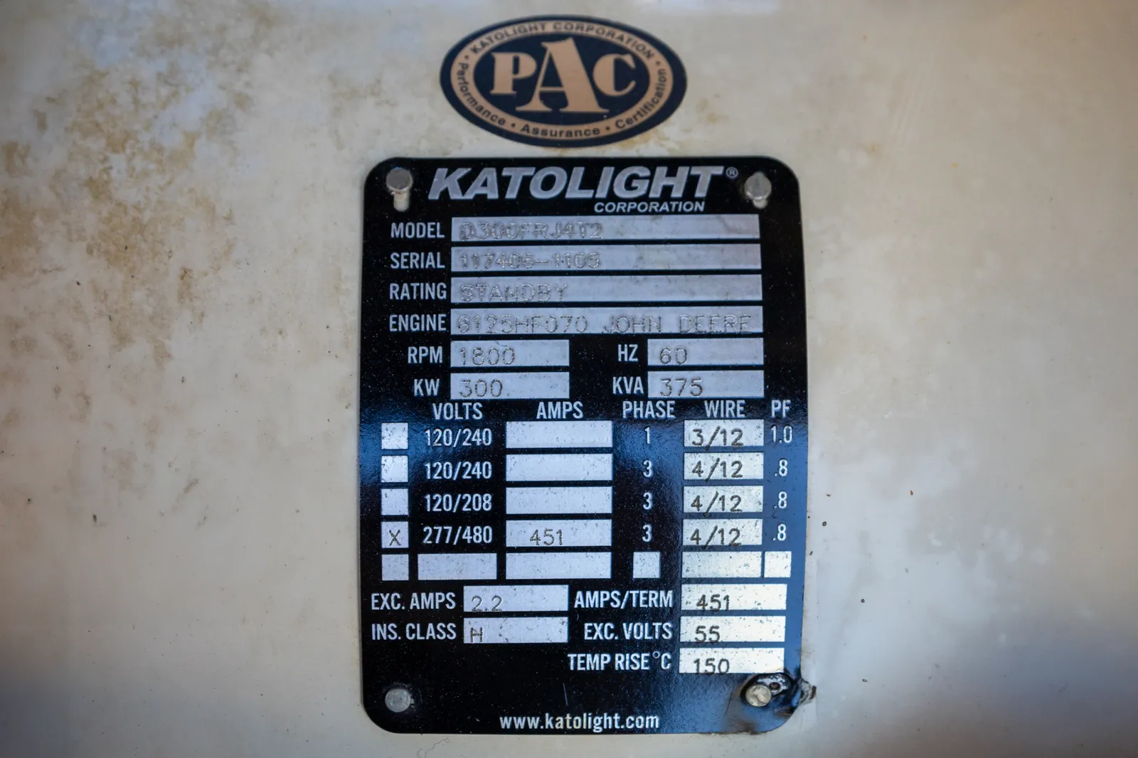 Used Katolight 300kW Diesel generator. This power unit has approximately 318 hours of use. It is ready to ship from our Jacksonville facility.