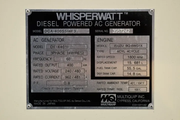 Used Multiquip 320kW Diesel generator. This Standby power unit features a Trailer/SAE enclosure and has approximately 125 hours of use. It provides Voltage Selector Switch power at MULTI-TAP and is ready to ship from our Pensacola, Florida facility.