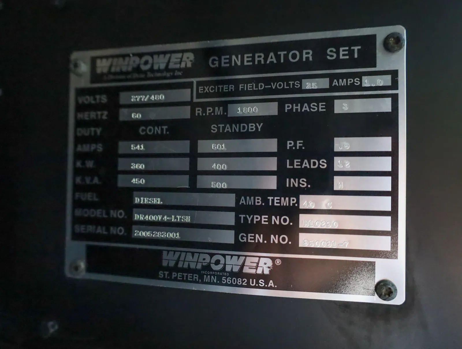 Used Winpower 400kW Diesel generator. This power unit has approximately 1647 hours of use. It is available at our Brighton facility.