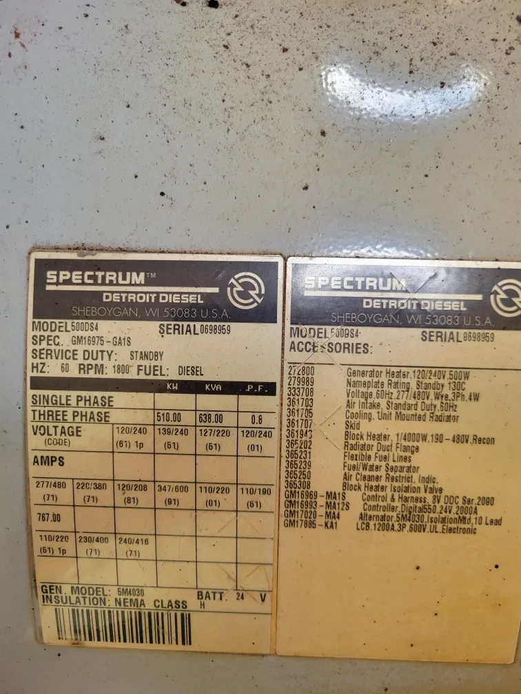 EnclosedUsed Spectrum 500kW Diesel generator. This power unit is enclosed and has approximately 730 hours of use. It provides Three-Phase power at 277/480v and is ready to ship from our Austin, Texas facility.