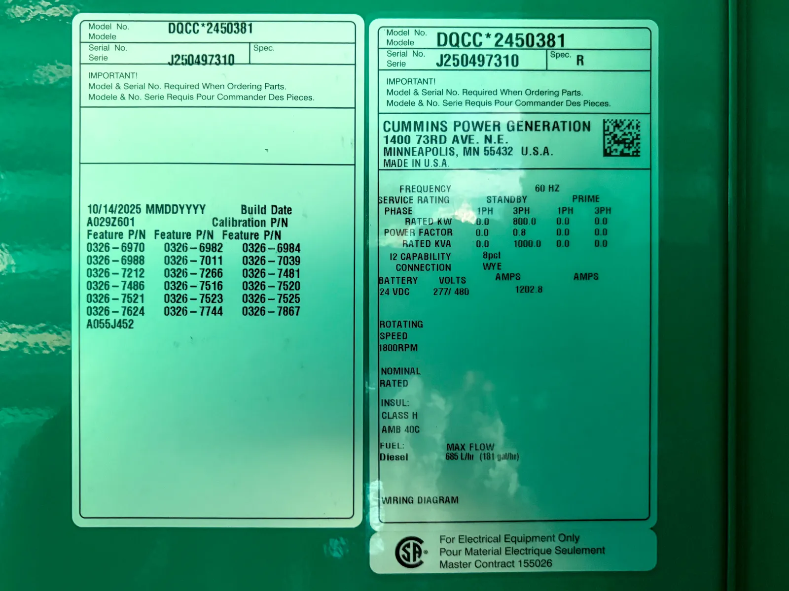 New Cummins 800kW Diesel generator. This Standby power unit is enclosed and has approximately 1 hours of use. It provides Three-Phase power at 277/480v and will be available for purchase upon completing our 31 Point Inspection Process.